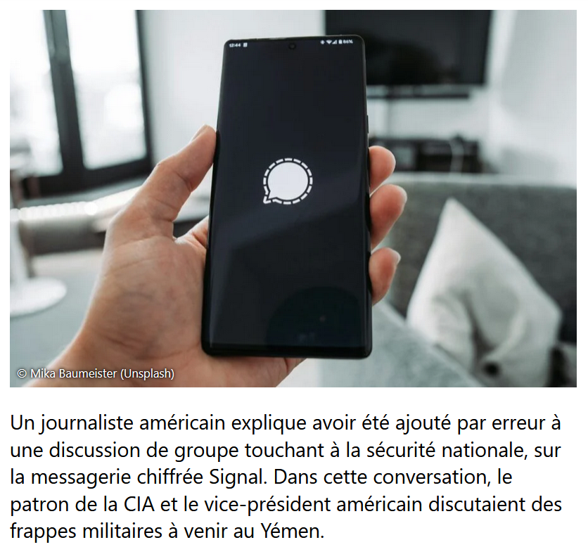 Si vous suivez l’actualitĂ©, vous ĂȘtes au courant de l’anecdote suivante qui a fait scandale aux USA… Un groupe de personnes a choisi l’application Signal pour Ă©changer des informations militaires confidentielles. Hauts gradĂ©s de l’armĂ©e et certains responsables politiques dont le vice prĂ©sident des Etats-Unis !