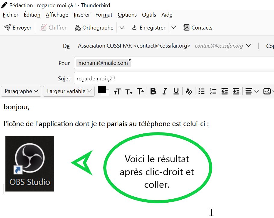 Désormais, il vous suffit de réouvrir votre message en cours de rédaction, de placer le curseur à l’endroit désiré, puis clic-droit et « coller »