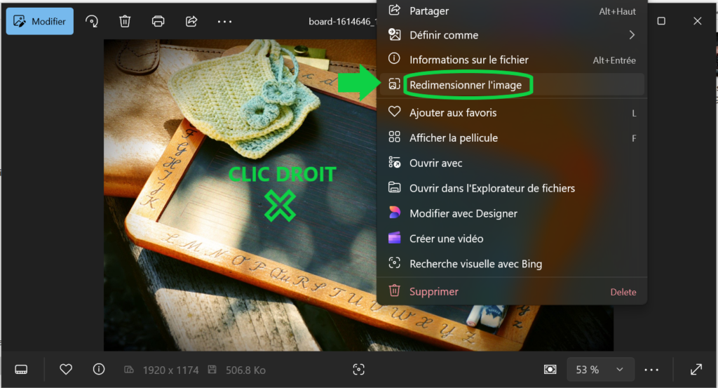 Sur cette photo, faites un clic-droit puis choisissez  » Redimensionner l’image »