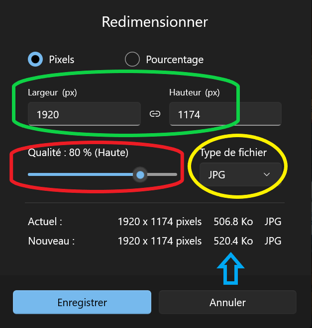 Dans la boite de dialogue qui s’ouvre, repérez les caractéristiques de votre fichier « Actuel » et « Nouveau ».