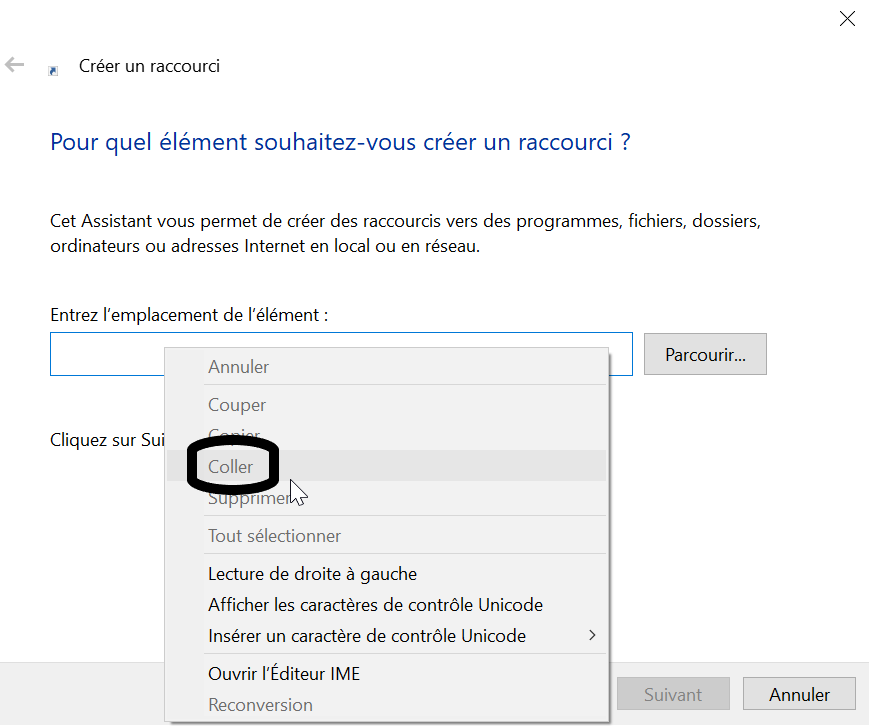 Etape 3, dans la fenêtre qui s’ouvre, placez votre curseur dans la zone « Entrez l’emplacement de l’élément » puis clic-droit et coller.
