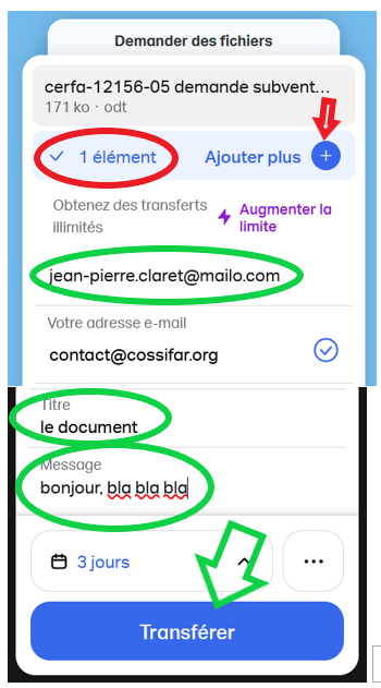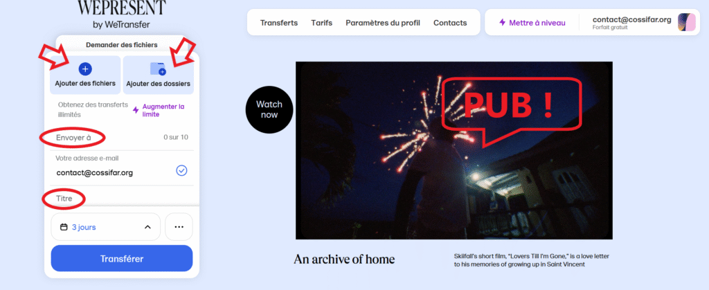 Sur la gauche, un formulaire que nous allons renseigner pour envoyer un GROS fichier à notre correspondant.